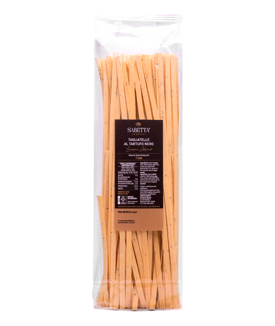 Ingredients: Durumwheat semolina (100% italian),eggs10%, black summer truffle (Tuber Aestivum Vitt.) 1%, flavour 1%.